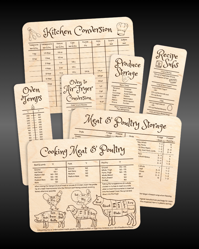 COMPREHENSIVE GUIDE: Features kitchen measurement conversions, oven temperatures, air fryer times, and detailed meat cooking temperatures all in one convenient set
