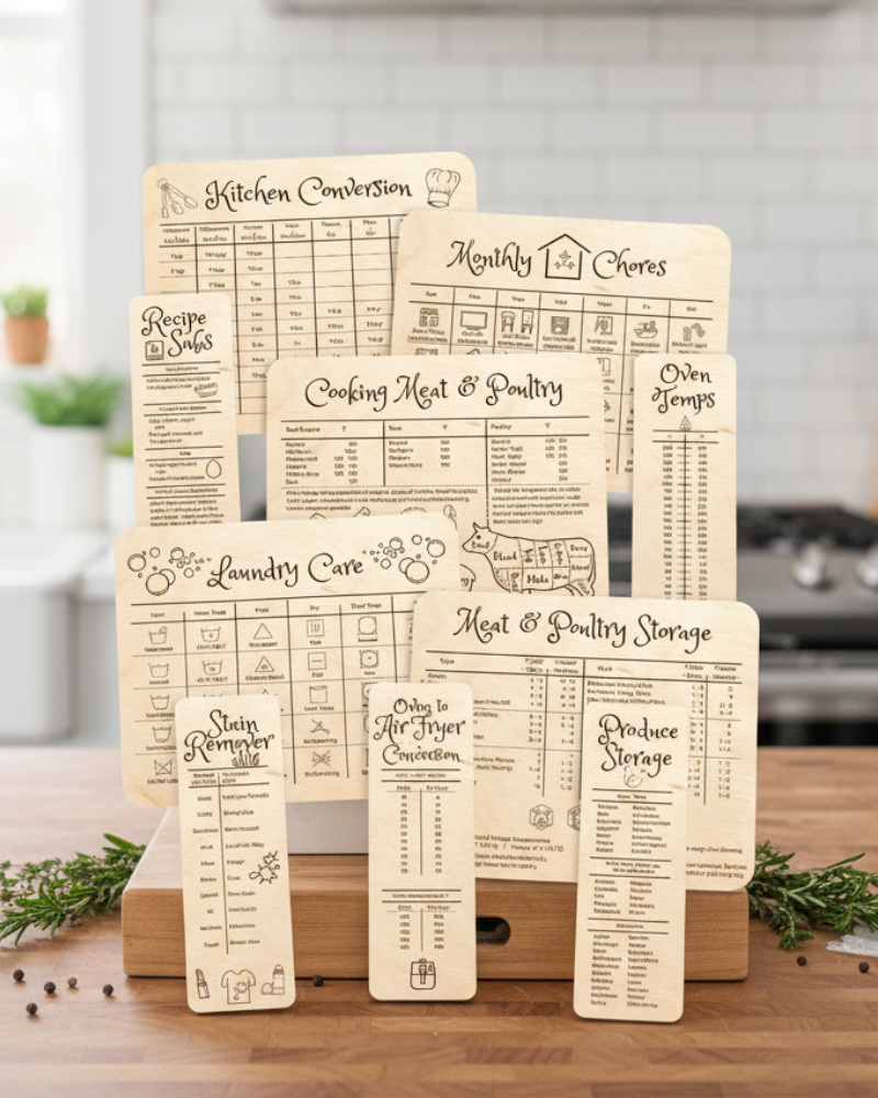 These practical boards feature essential kitchen conversion charts, cooking times for meat and poultry, food storage guidelines, monthly household chores checklist, and a detailed laundry care guide. The clear, vintage-style design includes easy-to-read meat cut diagrams, oven temperature conversions, air fryer timing adjustments, and produce storage recommendations. Perfect for quick reference while cooking, the kitchen conversion chart helps with measuring ingredients, while the meat temperature guide ensures properly cooked proteins. The laundry care section includes symbols and stain removal tips, making it invaluable for household management. These magnets stick firmly to your refrigerator or any magnetic surface, keeping vital information at your fingertips. The attractive design adds a charming touch to your kitchen while providing practical, everyday guidance for cooking and household tasks. An ideal addition to any home kitchen or thoughtful housewarming gift.