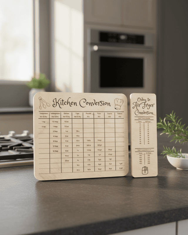 The kitchen conversion chart includes easy-to-read tables for converting between teaspoons, tablespoons, ounces, cups, pounds, pints, quarts, and gallons - perfect for scaling recipes up or down. The companion air fryer guide provides convenient cooking time and temperature conversions from traditional oven settings to air fryer settings, helping you adapt your favorite recipes. The vintage-inspired design with elegant script typography and chef's hat motif adds a decorative touch while remaining highly functional. The charts feature clear, organized layouts with common cooking measurements and conversions that every home cook needs. These durable reference guides eliminate the guesswork from measurement conversions and help ensure your recipes turn out perfectly every time. Whether you're an experienced cook or just starting out, these conversion charts are an invaluable kitchen tool that will save you time and prevent cooking mishaps.